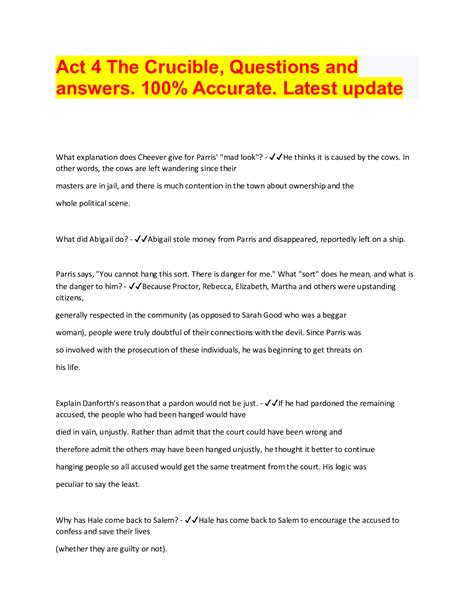 Read Online The Crucible Act 4 Questions And Answers PDF online is a convenient and frugal way to read The Crucible Act 4 Questions And Answers you love right from the comfort of your own home. Yes, there sites where you can get PDF "for free" but the ones listed below are clean from viruses and completely legal to use.